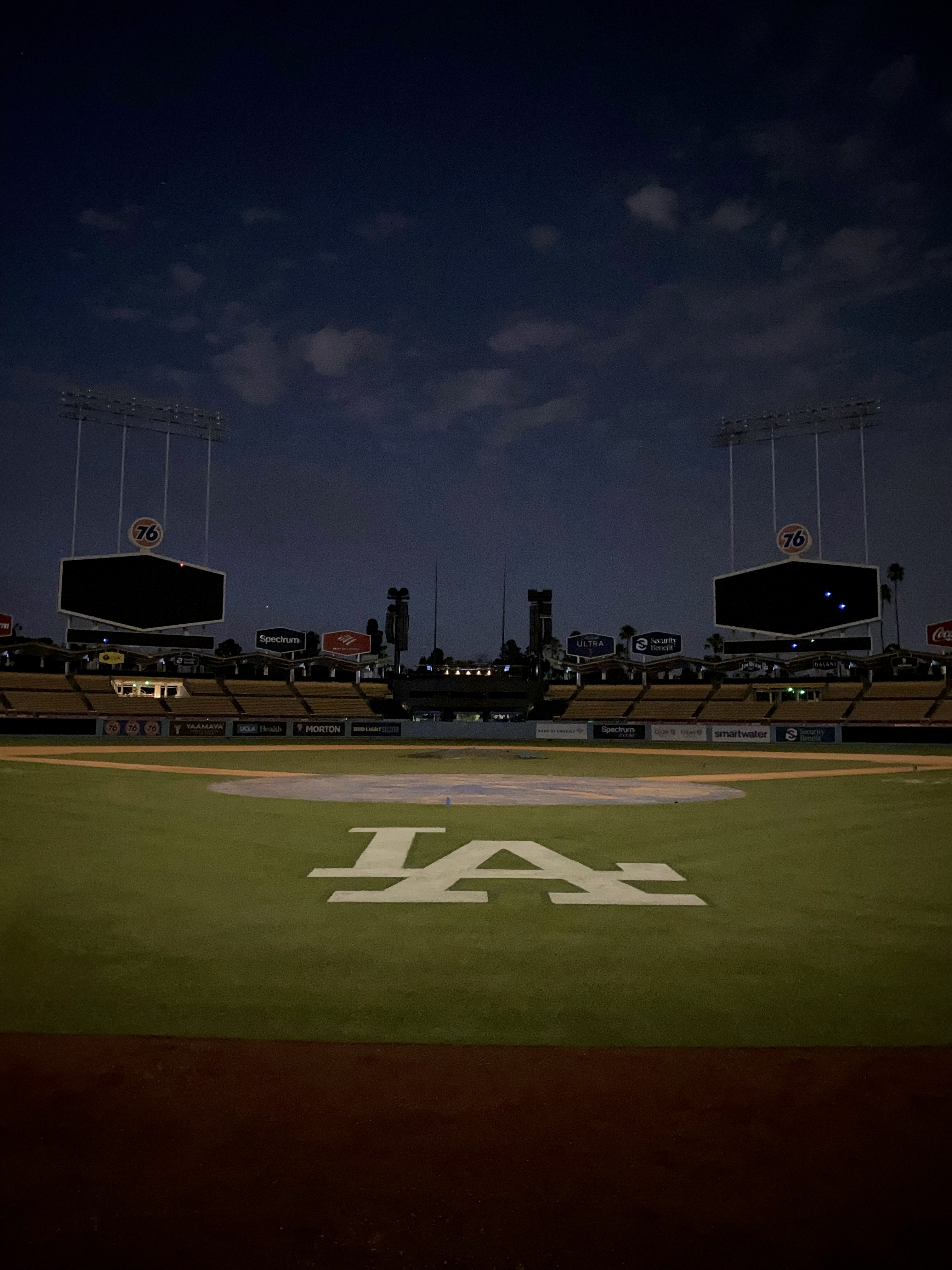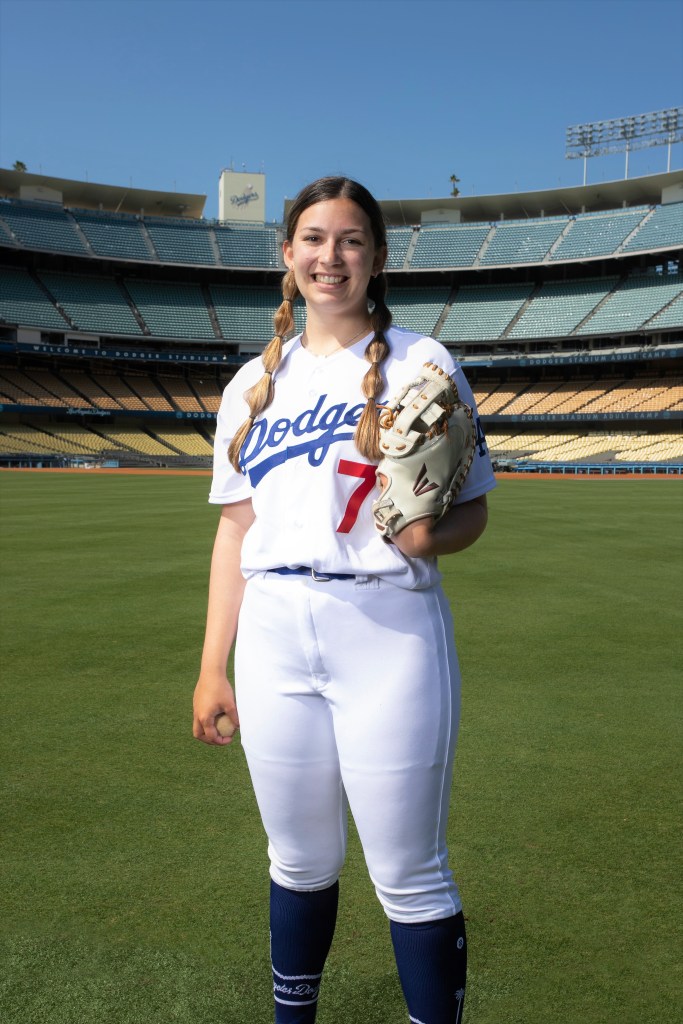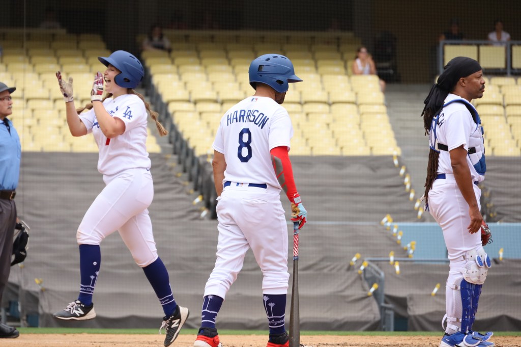 Megan and I had played catch at Dodger Stadium a few years before. We’d ran on to the field before fireworks and played a rushed game of catch while a few onlookers wished they’d thought to bring their gloves. When we went to a game the next year, it went extra innings, so the on-field access was canceled for that night. Megan was so bummed that we left before the fireworks started. But here we were, not only stepping foot back onto the field, but doing so wearing full Los Angeles Dodgers uniforms!