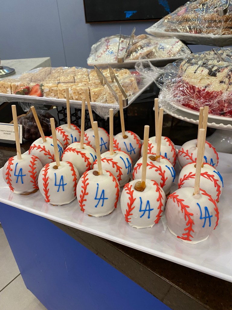 Checked in, we took the elevator downstairs to the Dugout Club, walking past the wall of Cy Youngs, MVPs, Gold Gloves, and of course, World Series trophies. Rick Dempsey, Bill Russell, and Orel Hershiser were all talking with campers while Megan and I checked out the most important thing, the spread. It wasn’t the filet and salmon that caught our eye, it was the dessert table. LA-adorned caramel apples, cookies, and cakes… It felt like a shame to spoil dessert with dinner. Out of the camps I’ve been to, the Dodgers spread was undoubtedly the most impressive, and was a promise of the few days to come. Orel Hershiser spoke to the camp, before passing his World Series rings around the room and taking pictures. Megan and I walked out to the completely empty field and just stared out at the dark. If only we could have slept there.