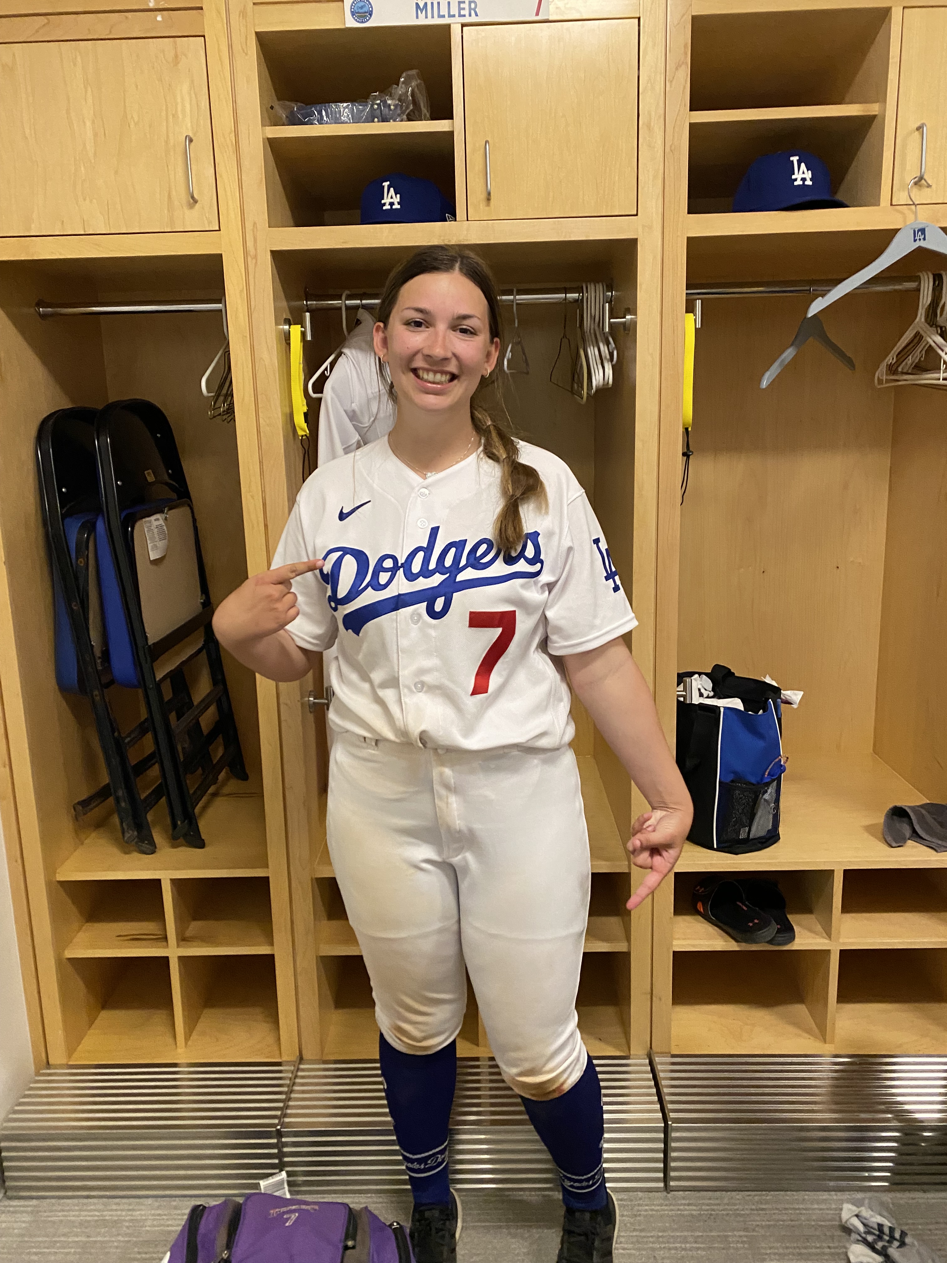 After pictures it was time to hit the field! Like other camps I’d been to, the team had us rotate through infield and outfield stations, as well as gave us a chance to throw from the mound in the bullpen. It felt good to get some practice in. I don’t play outside of camps, as much as I would love to, so I need the time to see some balls. It’s hard coming in cold and tracking fly balls, so I was happy to see a little action. Since camp started, Megan almost seemed like a celebrity. There were a few young men there, but of the four women, Megan was the youngest by a lot. I had a few awkward interactions from people that wondered if she was my wife or girlfriend, which I’d laugh and respond, “No dude, she’s my kid.” Megan heard that too, laughed, and said “Gross! Why do they think that?” The only response I could come up with was to shrug my shoulders and say, “Well, it’s LA, kid.”